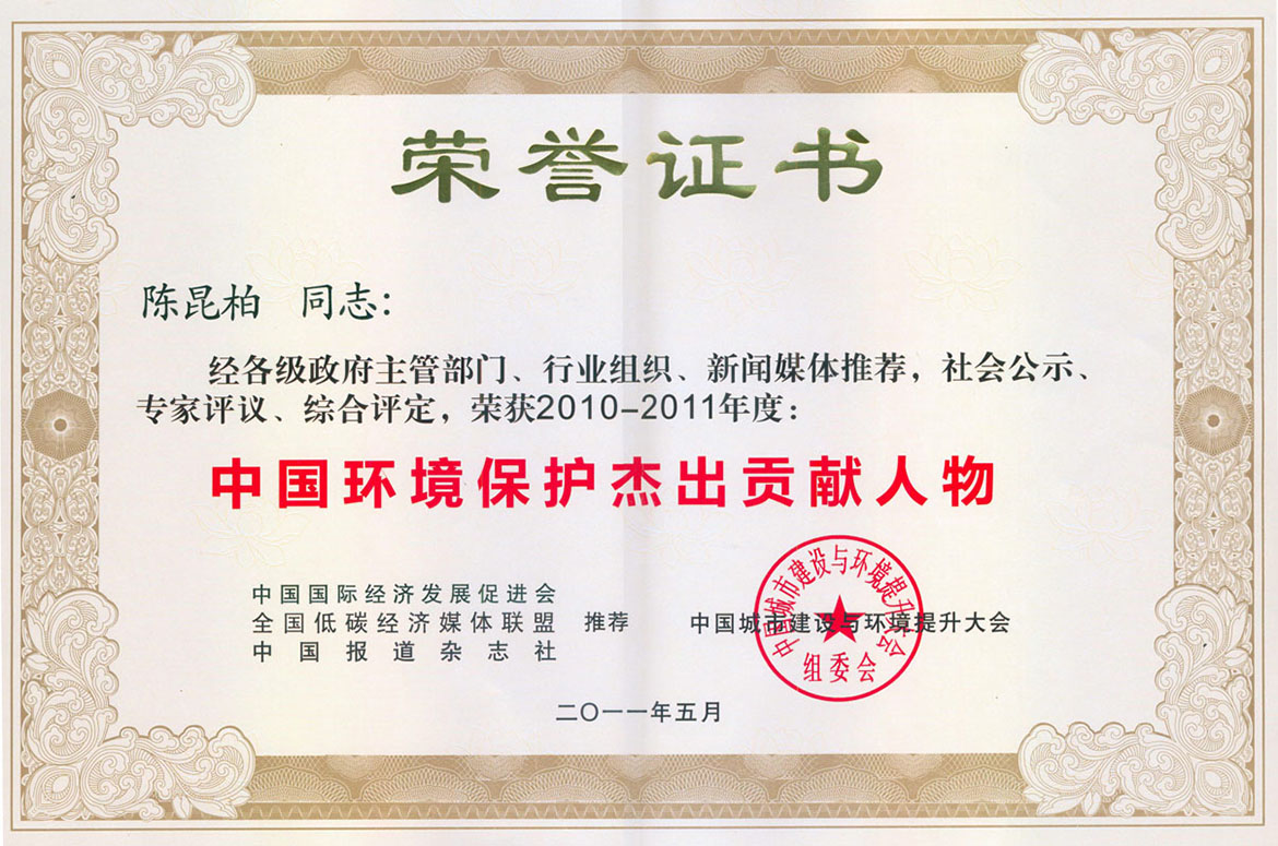 經各級政府主管部門、行業組織、新聞媒體推薦,社會公示、專家評議、綜合評定,陳昆柏同志榮獲2010-2011年度“中國環境保護杰出貢獻人物”