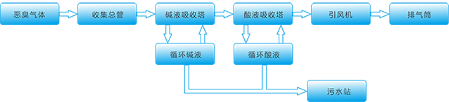 本技術針對的是污水處理站的惡臭氣體,污水處理站的惡臭氣體主要來源于進水格柵、嚗氣沉沙池、初沉池、污泥脫水間、污泥沉淀池等;主要成分有氨氣、硫化氫和甲硫醇等無機物。根據(jù)污水處理站惡臭氣體的成分和特性,采用化學吸收法,使用螺旋噴霧填料裝置治理此類惡臭氣體,其治理效率極高。